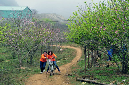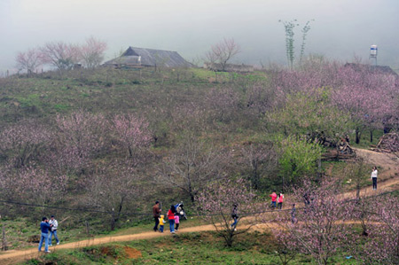 Đào nở phủ trên mái nhà trên bản của người Mông. |