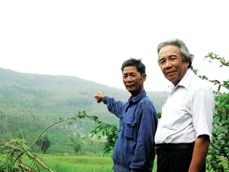 Ông Trần Phước Hòa (phải) và ông Lê Tư cho rằng: “ 50 năm về trước cọp thường xuyên xuất hiện trên khu vực núi Phước Thuận”. |