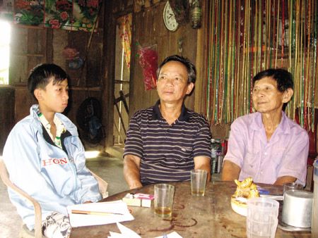 Ông Năm Long (giữa) và ông Ba Đây, hai người rất am hiểu sử làng kể về chiến tích của Trần Bình cho con cháu nghe. |