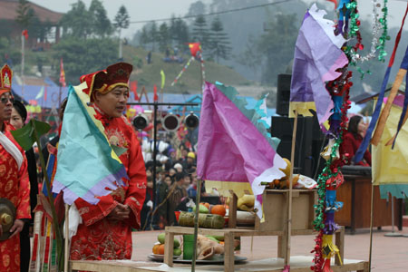 Ngày hội, mọi nhà đều tham gia làm lễ. Mỗi nhà chuẩn bị một mâm cúng với gà trống luộc, thịt lợn nạc và cặp mon hua (bánh chưng của người Tày), xôi ngũ sắc và trứng gà luộc. Người dân quan niệm, xôi đỏ tượng trưng cho mặt trời, xôi vàng tượng trưng cho mặt trăng. Trên mỗi đĩa xôi là một con chim én bằng giấy đỏ mang biểu tượng mùa xuân.