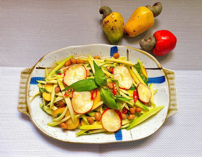 Thành phẩm:Gỏi trái điều mang đến hương vị chua ngọt chát nhẹ mới lạ, xoài xanh giòn giòn kèm lạc béo bùi hấp dẫn, là món thích hợp ăn trong ngày hè oi nóng.