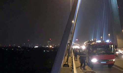 Gần 21h đêm 5/2, hai người đàn ông đi xe máy trên cầu Nhật Tân, Hà Nội, sau đó dừng đỗ bên mép cầu. "Một người bước qua lan can cầu, không may trượt chân ngã xuống sông Hồng", nhân chứng cho hay.