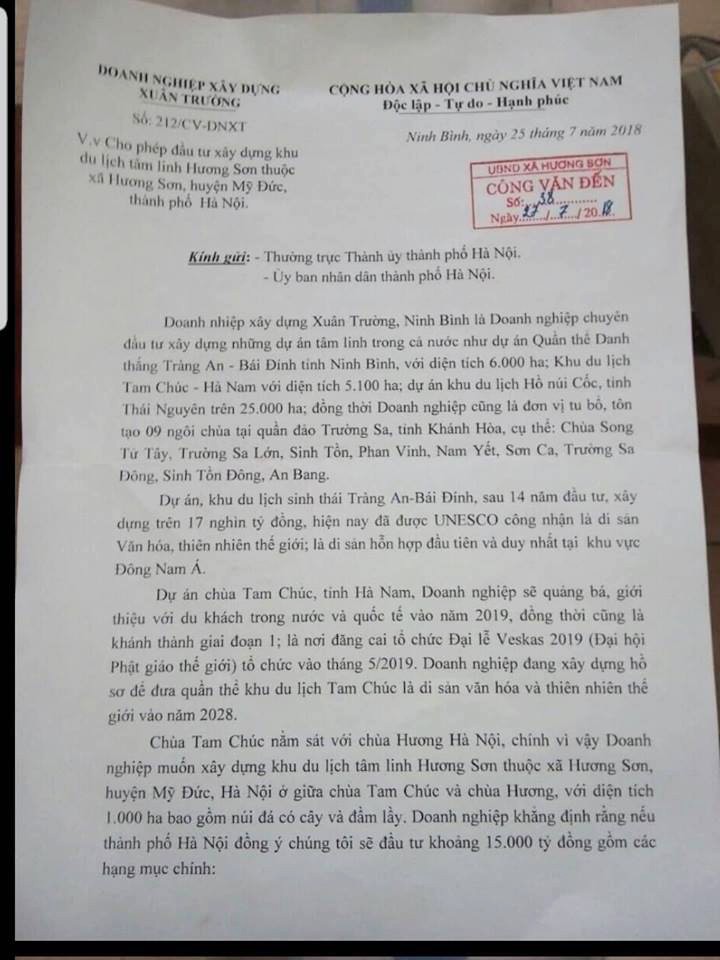Công văn của Doanh nghiệp xây dựng Xuân Trường xin phép đầu tư xây dựng khu du lịch tâm linh Hương Sơn