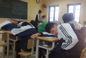 Tại trường THPT Trung Văn (Từ Liêm, Hà Nội), rất dễ dàng bắt gặp ngoài cổng trường những bước đi thất thểu, khuôn mặt bơ phờ, uể oải vì thiếu ngủ, hay những cái đầu “gật gù”, những đôi vai phủ phục xuống bàn ngủ trong lớp.