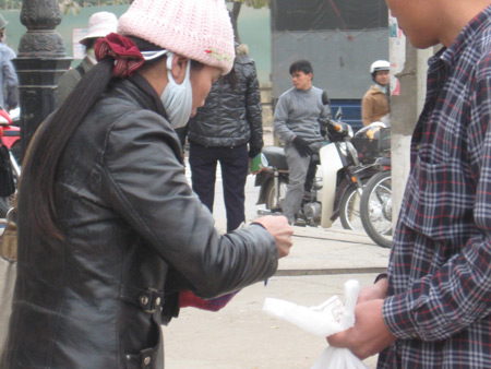 | "Nhân viên tăm tre" "rởm" đang chèo kéo khách trên cầu vượt trước bệnh viện Bạch Mai. |