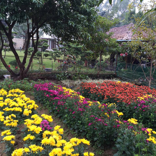Khu vườn được quét dọn sạch sẽ và trang trí những bồn hoa mới