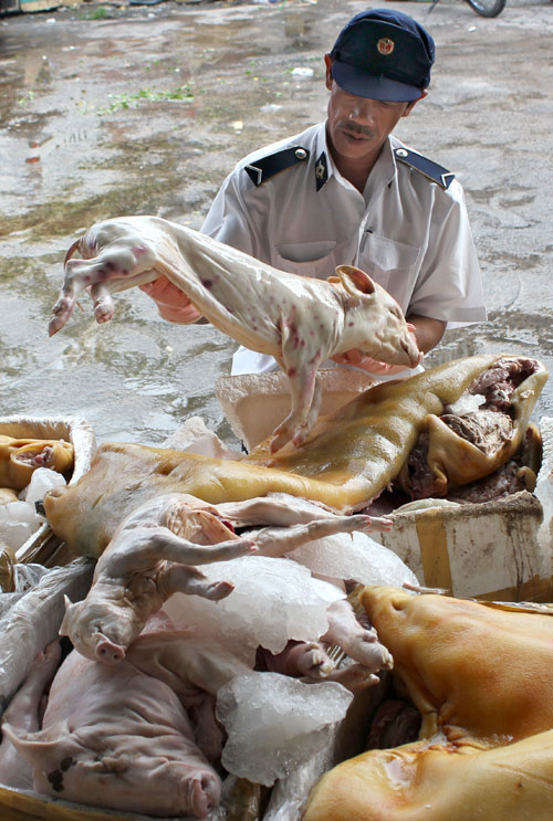 Một cán bộ kiểm dịch động vật cũng nói ngày 27/11, trạm kiểm dịch động vật Thủ Đức bắt giữ hai xe khách từ Đắk Lắk và Quảng Ngãi vận chuyển hơn 1,6 tấn heo sữa, nội tạng heo và một lô thịt heo nái được “phù phép” bằng cách xăm da, làm giả heo rừng để đưa vào TP.HCM tiêu thụ.