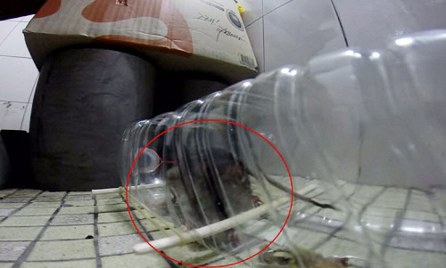 Với cách làm này, chuột chui vào bẫy ăn mồi sẽ khiến dây chun bung ra, đóng ngay nắp chai lại khiến chúng chẳng còn đường thoát.