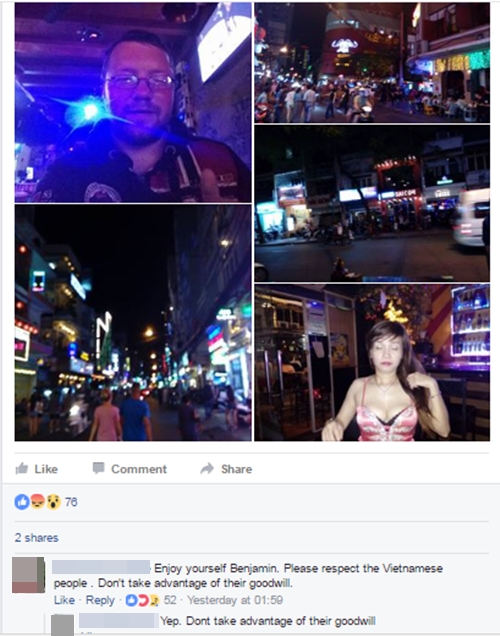 "Enjoy yourself Benjamin. Please respect the Vietnamese people. Don't take advantage of their goodwill" (Tạm dịch: Hãy tôn trọng người Việt và đừng lợi dụng lòng tốt của họ), một người nước ngoài để lại bình luận khi thấy ảnh người đàn ông ăn xin vui chơi ở phố Tây Bùi Viện.