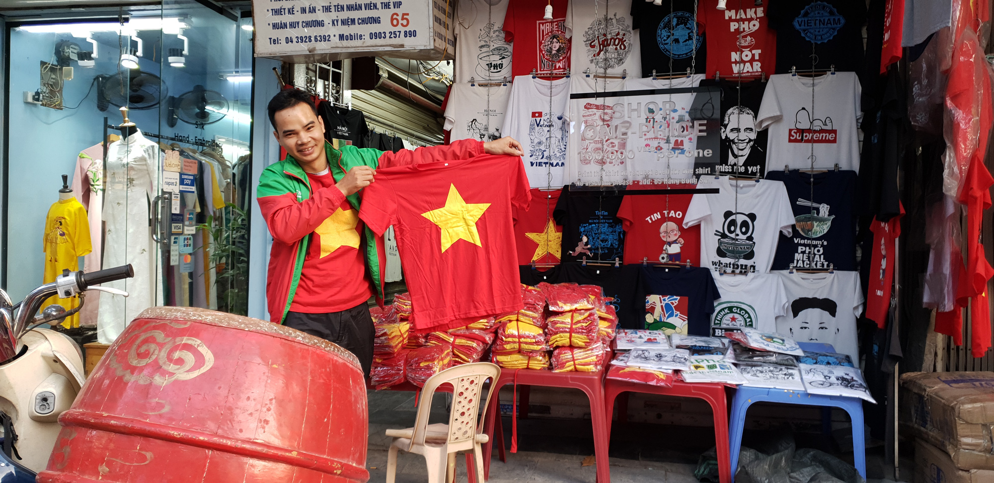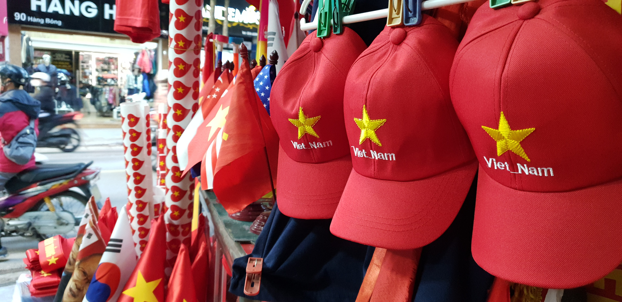 Cổ động viên sớm mua phụ kiện để cổ vũ cho tuyển Việt Nam, tại cửa hàng của chị Nguyễn Thị Oanh, số 83 Hàng Bông.