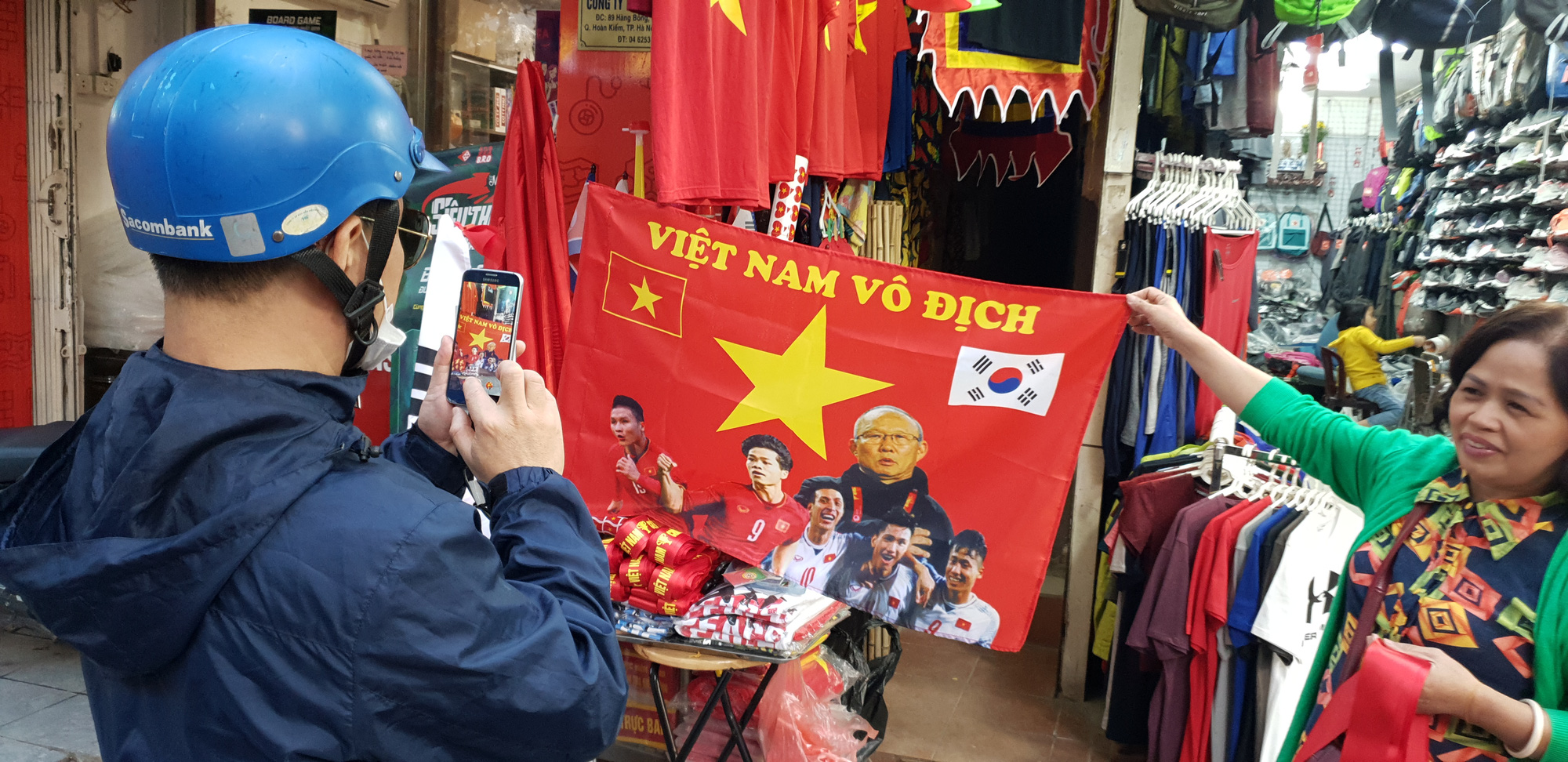Bà Nguyễn Thị Oanh (46 tuổi, ở số 83 Hàng Bông, Hoàn Kiếm) cho biết, các mặt hàng phục vụ cổ động viên năm nay cũng như bao trận bóng đá khác. Tuy nhiên, so với những trận chung kết đã từng diễn ra thì sức tiêu thụ hàng thời trang, hàng phụ kiện không thể sôi động nhưng có điều đặc biệt là trong chiều nay, trước khi trận đấu diễn ra thì người mua cờ, áo chủ yếu là khách nước ngoài. Còn khách Việt Nam thì số lượng ít hơn nhưng lại mua với số lượng lớn để đi tiêu thụ nơi khác.