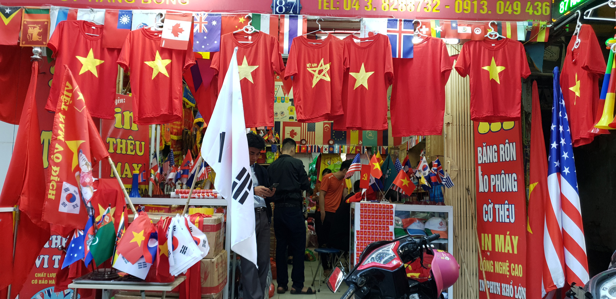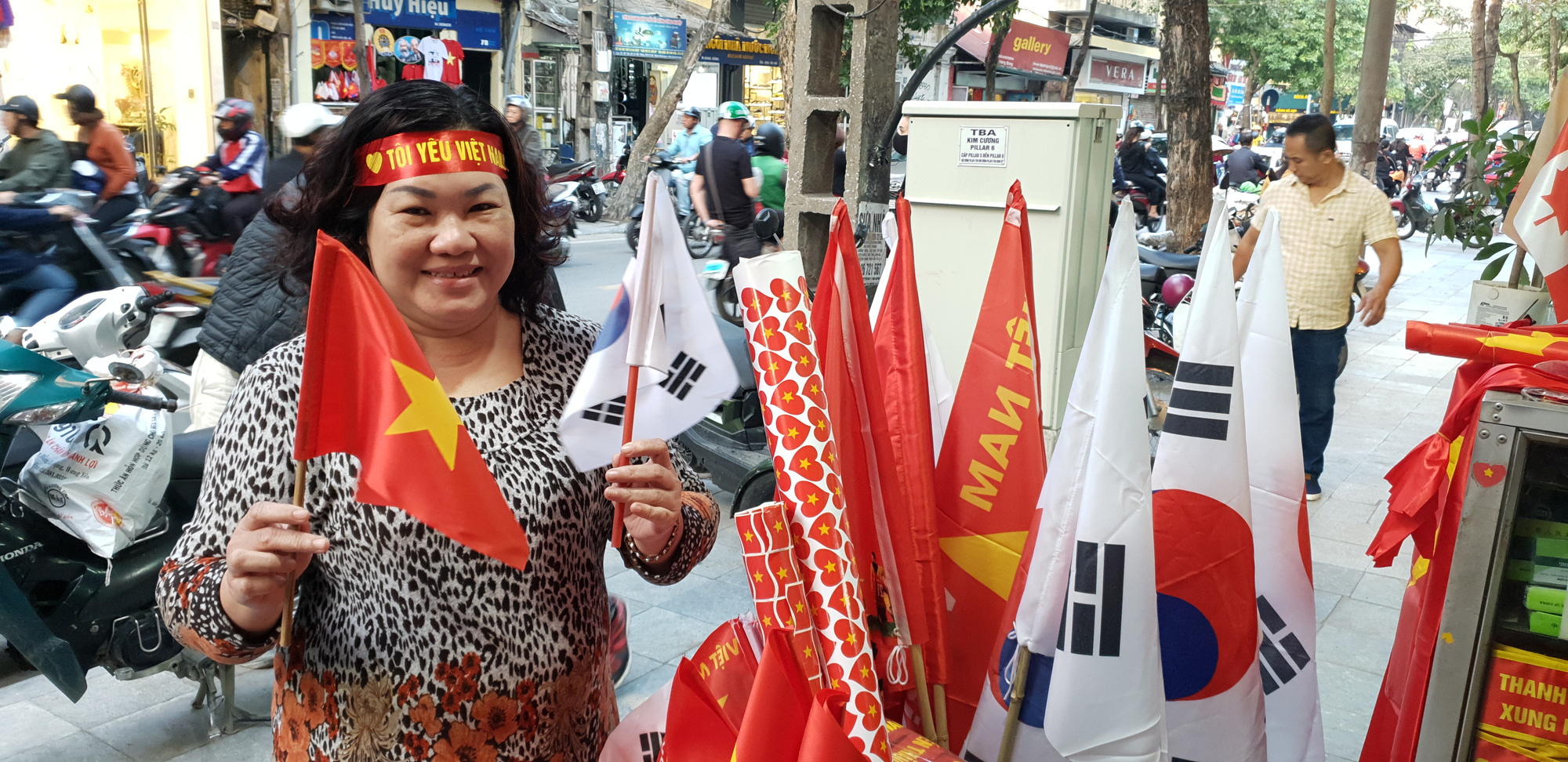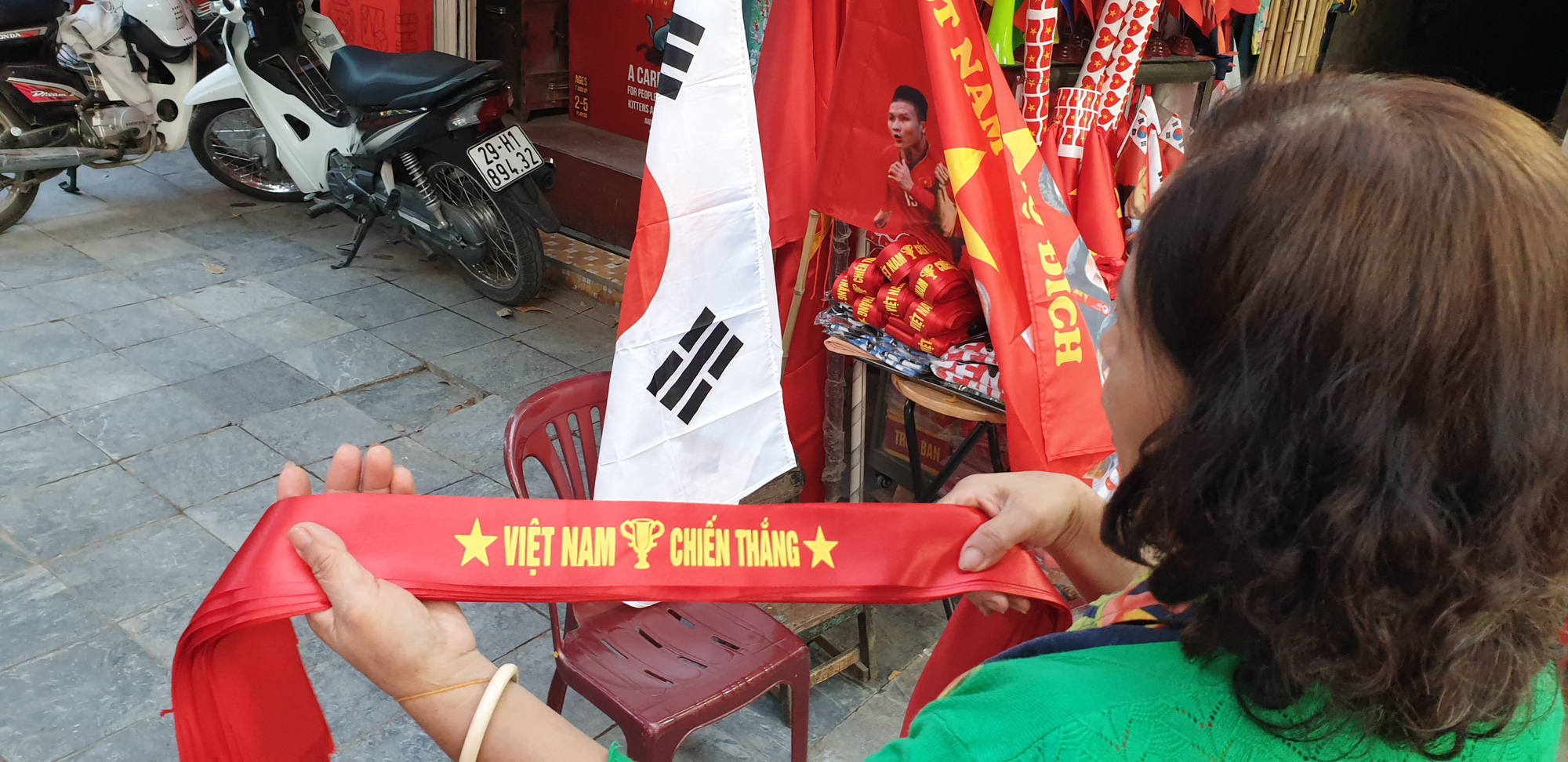 Bà Trần Thị Thu (58 tuổi, ở Hàng Bông) cho biết, giá cả các mặt hàng thời trang, phụ kiện năm vẫn giữ nguyên giá, như băng-rôn bán buôn chỉ 2.000 đồng/chiếc và bán lẻ là 5.000 đồng/chiếc. Áo đỏ in sao vàng 5 cánh có giá từ 40.000 – 120.000 đồng/tùy loại. Cờ Việt Nam và cờ Hàn Quốc cũng chỉ dao động từ 70.000 đồng – 150.000 đồng. Đắt nhất là cờ in hình cầu thủ và có dòng chữ "Việt Nam vô địch" là có giá 150.000 đồng/chiếc.