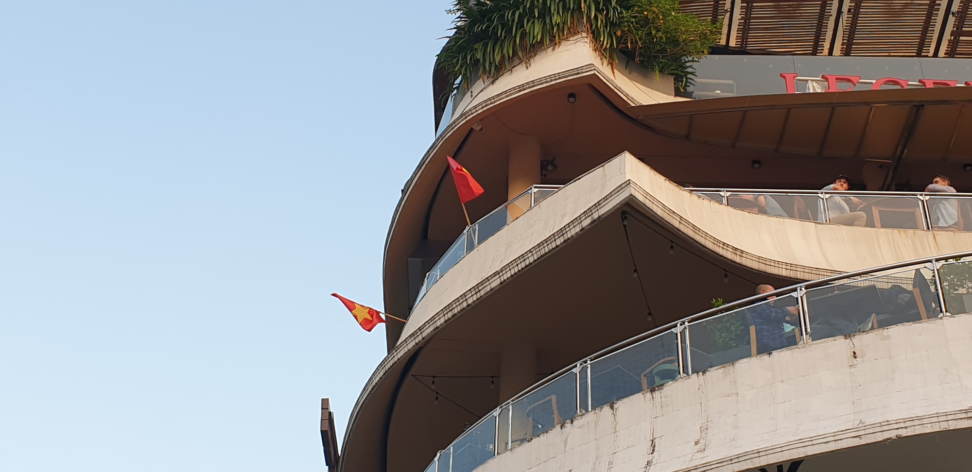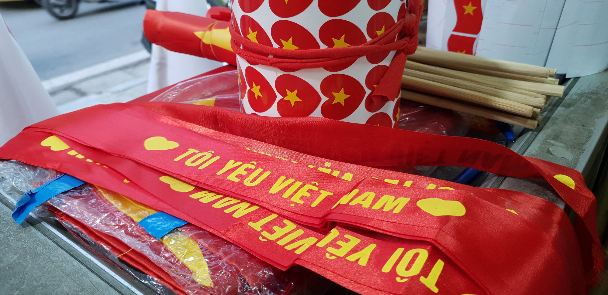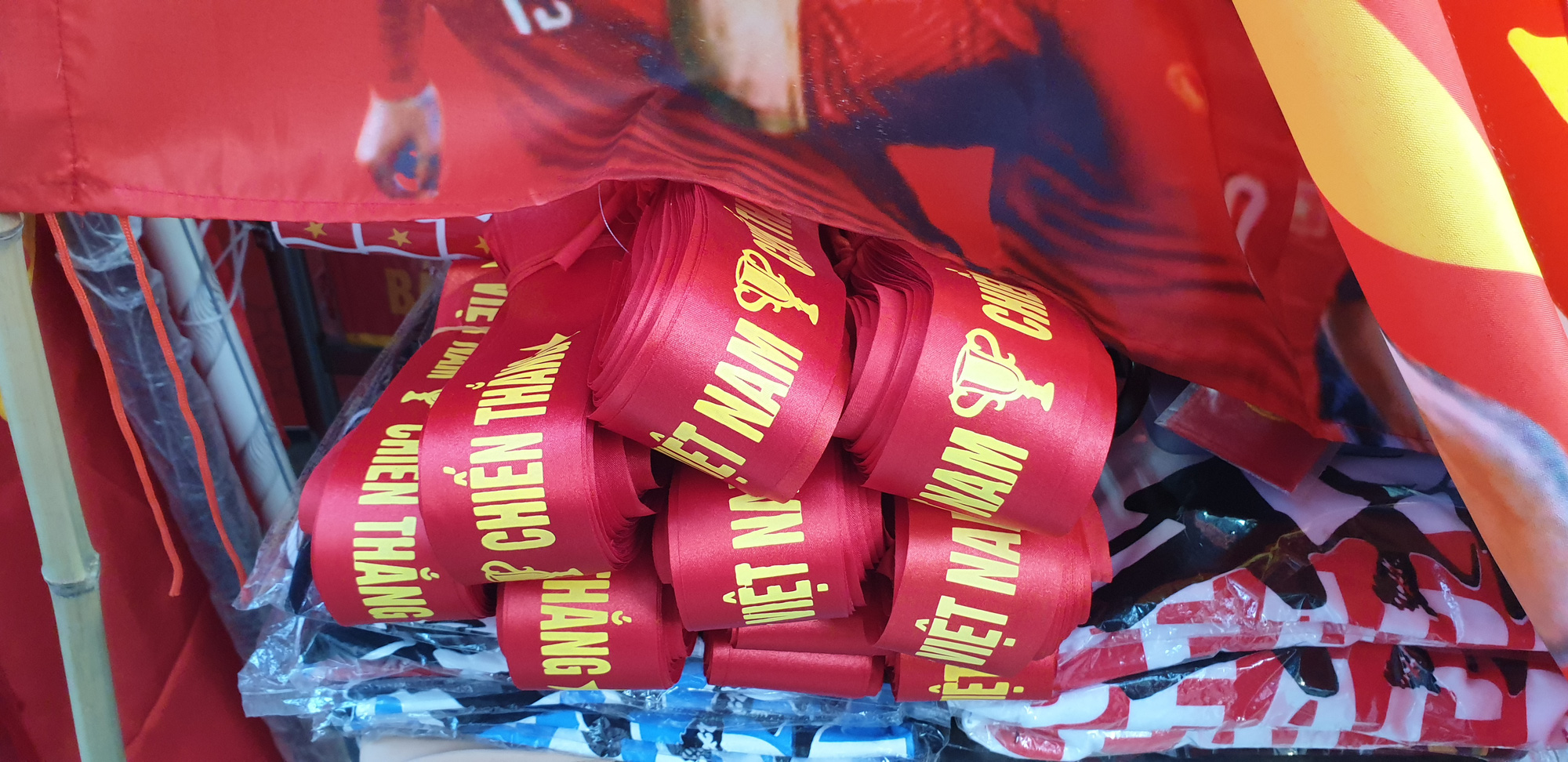 Một băng rông có in hình "Việt Nam chiến thắng" được chị Thu bán buôn giá 2.000 đồng/chiếc và 5.000 đồng/chiếc bán lẻ.