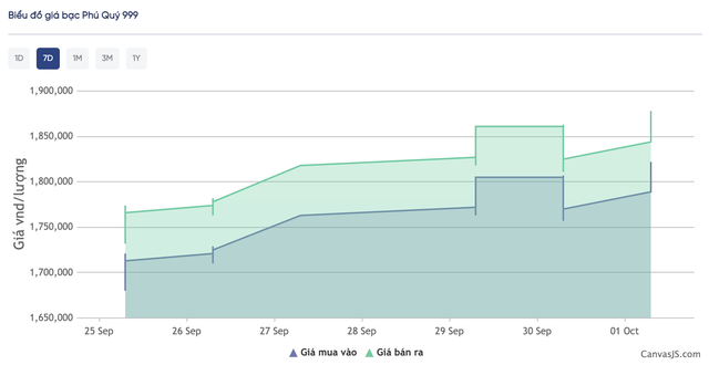 Ghi nhận của phóng viên lúc 14h54 hôm nay (01/10), thương hiệu Phú Quý niêm yết giá bán ra đối với bạc miếng, bạc thỏi là 1,868 triệu đồng/lượng; 49,813 triệu đồng/kg.