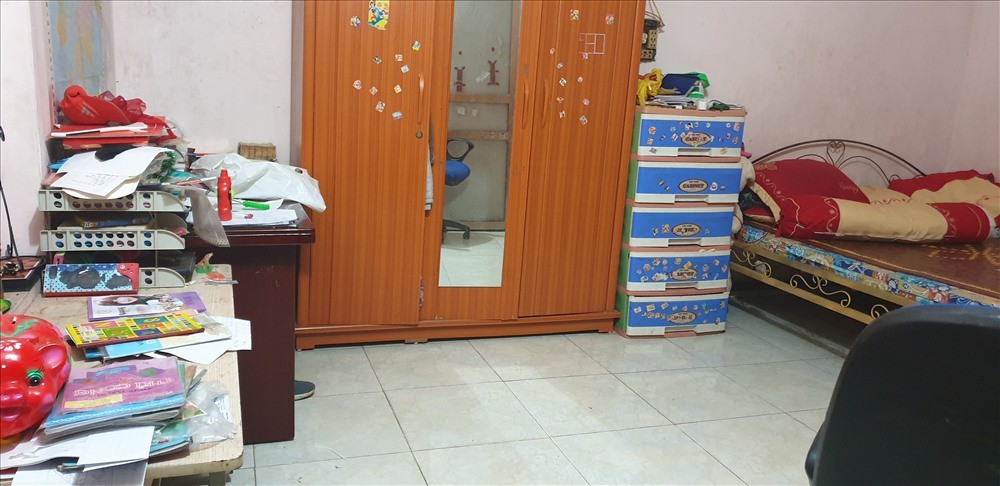 Trong căn phòng hơn chục m2, 4 người nhà cô Chung đang ở, chỉ có một số vật dụng rất đơn giản, cũ kĩ: 1 chiếc giường ngủ, 2 bàn học và chiếc tủ đựng quần áo.