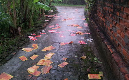 Vàng, hương, dầu nhớt đổ bừa bãi từ ngõ vào đến sân nhà ông Khu.. |