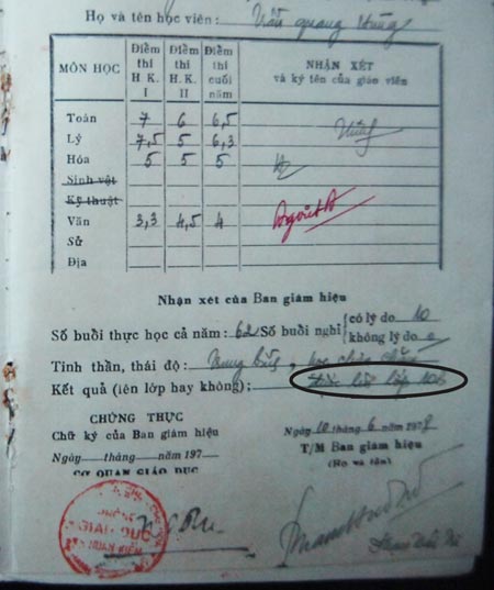 Trang cuối cùng được ghi trong học bạ Bổ túc cấp III của ông Trần Quang Hùng. Ảnh chụp hồ sơ. |