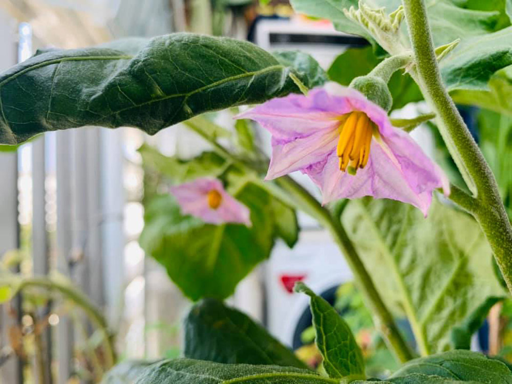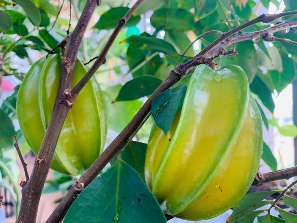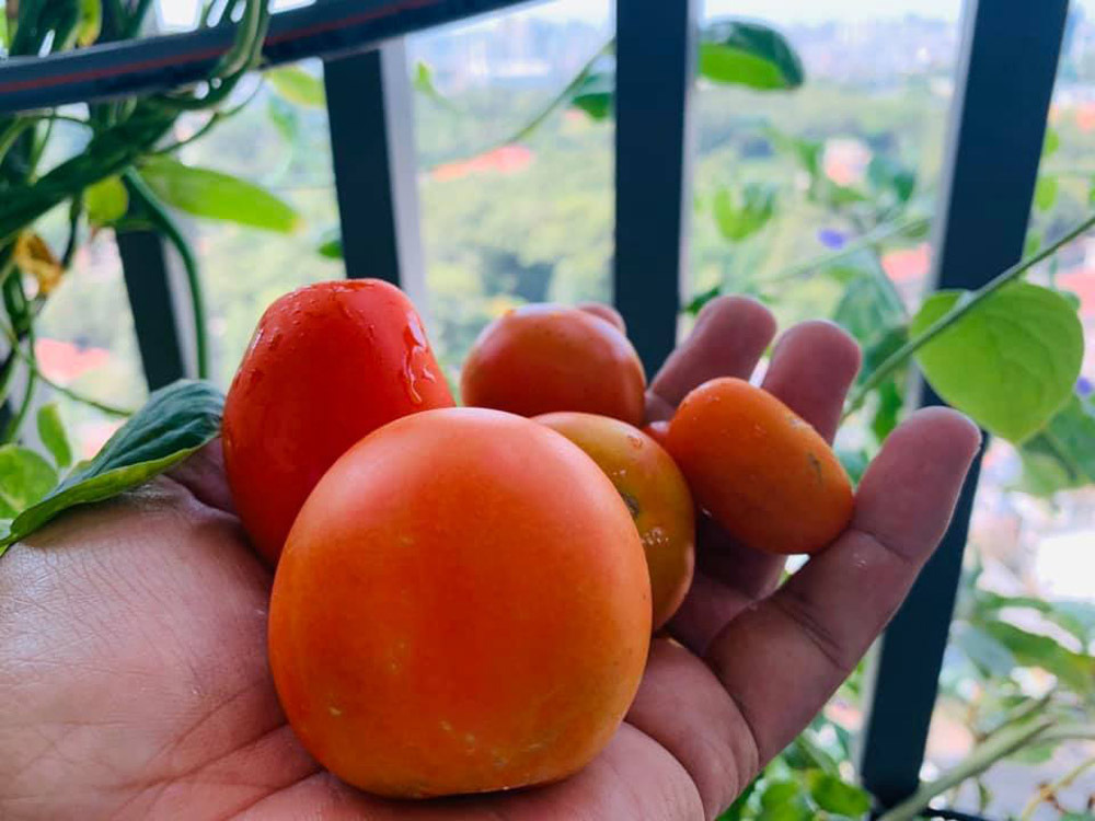 Cà chua cuối vụ vẫn tiếp tục cho ra trái. Rau mồng tơi, khoai lang, lá lốt, càng cua… xanh mướt quanh năm. Cải cay, rau dền đỏ ra lá đều đều. Khế ngọt vẫn vàng ươm. Cà tím, ớt, khổ qua... đang trổ hoa, lại thêm giàn đậu cô ve, 3 cây đu đủ cũng bắt đầu đơm trái'.