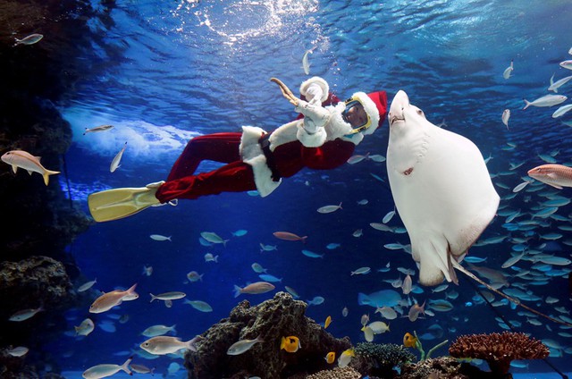 Một thợ lặn trong trang phục ông già Noel bơi trong bể cá ở Thủy cung Sunshine, Tokyo, Nhật Bản . Ảnh: Reuters.
