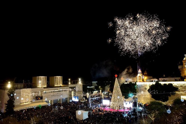 Người Cơ đốc giáo Palestine mừng Giáng sinh tại quảng trường Manger, bên ngoài Nhà thờ Chúa Giáng sinh ở thành phố Bethlehem thuộc khu Bờ Tây. Ảnh: AP.