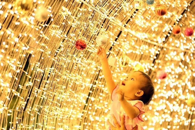 Một em bé ngắm đèn trang trí Giáng sinh ở Yangon, Myanmar. Ảnh: Xinhua.