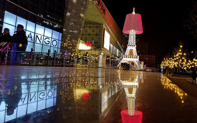 Cây thông Noel mô phỏng tháp Eiffel trước một trung tâm mua sắm ở Bắc Kinh, Trung Quốc . Ảnh: SCMP.