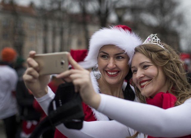 Hai cô gái chụp ảnh selfie trong cuộc thi chạy Giáng sinh truyền thống hàng năm trên đường phố Vilnius, Litva. Ảnh: AP.