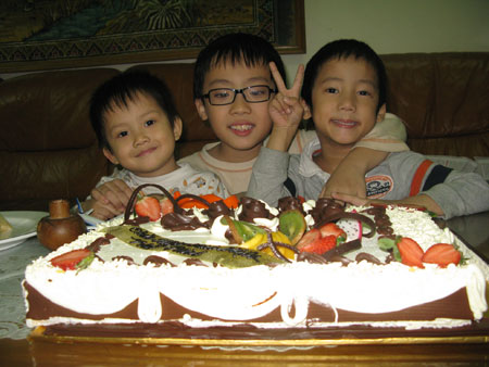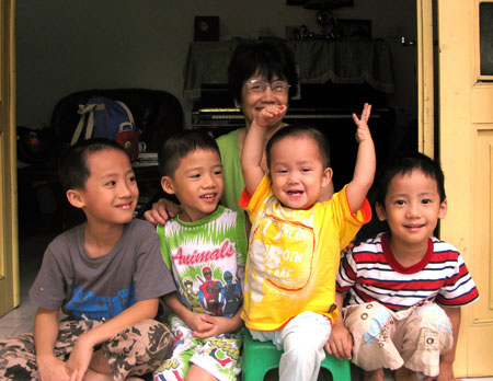 ![]() Bé Thiện Nhân (trái) và các anh nuôi. |