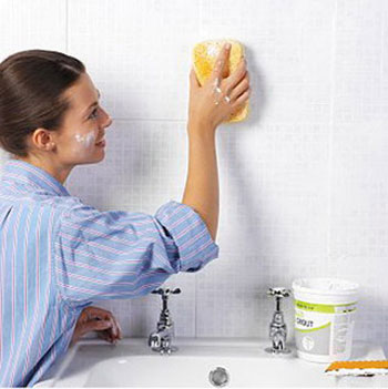 Với phòng tắm thường bị đọng nước lâu ngày hoặc sàn bị nước đóng phèn, khoáng sắt, có thể đổ tro bếp lên, đổ chút nước vào chà nhẹ cho đều, để 5 phút, rồi dùng bàn chải chà mạnh. Vết ố nhẹ thì pha thêm chút muối vào nước tẩy sàn, thấm đều lên mặt sàn, để chừng 15 phút rồi lau sạch. Với những vết cặn bám vào kẽ, sàn, hay bề mặt men sứ thì có thể dùng chút vôi ăn trầu và nước oxi già để chà rửa. Với sàn đá mài hoặc sàn xi măng, hãy dùng muối, giấm pha nước soda để chà rửa. Cách này có thể áp dụng cho bề mặt men sứ trong nhà.
