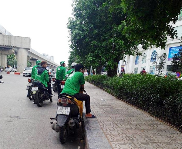 Hàng chục tài xế xe ôm grab túc trực chờ khách chiều ngày 1/7.