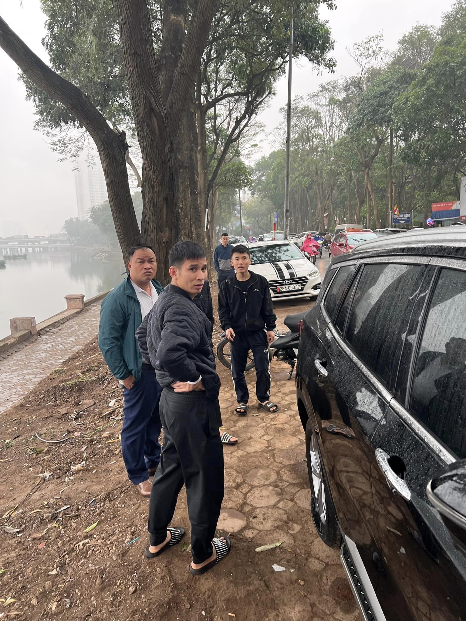 Sáng 10/4, người dân tá hỏa nhiều ô tô đỗ ven hồ Linh Đàm nghi bị chọc thủng lốp. Ảnh: PB