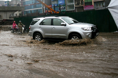 Ôtô con bì bõm qua quãng đường ngập. |
