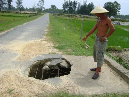 Theo quan sát của chúng tôi, chiều rộng, chiều dài cây cầu không lớn, nhưng ở giữa cầu xuất hiện một “miệng tử thần” với đường kính khoảng 70 cm. Hố cầu này rất nguy hiểm cho người tham gia giao thông, nhất vào những lúc chập tối.