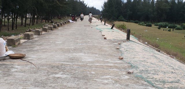 Tép được phơi ngay trên đường đê chắn sóng