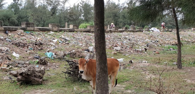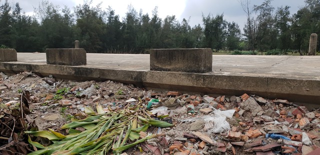 Bãi phơi tép kho của ngư dân xã Xuân Hội nằm ngay trên đê chắn sóng, xung quanh cỏ mọc um tùm. Điều đáng nói là cách đó không xa là bãi rác tập trung của người dân nơi đây.