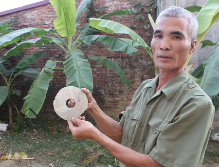 Ông Ngô Văn Mến với cổ vật bằng đá mới đào được sau khi cày ruộng. |