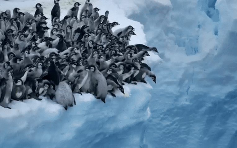 Đoạn video ghi lại bởi National Geographic năm 2024 cho thấy cảnh tượng hàng trăm con non đang lạch bạch xếp hàng dài hướng về phía rìa vực thẳm. Sau khi một con dũng cảm bất ngờ nhảy ra khỏi khối băng và rơi xuống nước với tiếng động lớn, những con còn lại như được tiếp thêm động lực, bắt đầu nối gót thực hiện hành vi tương tự.