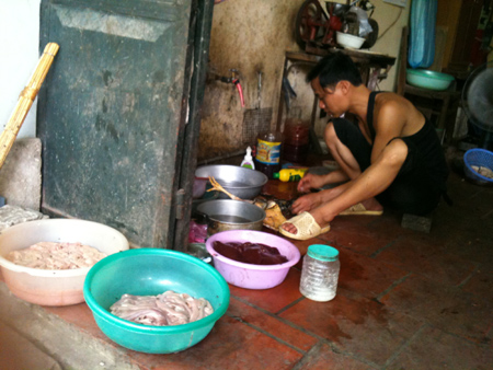 Người bán hàng này bày lòng ra chậu, không che đậy để ruồi bâu tự nhiên, không những thế còn làm gà ở nền gạch gần cống nước. |