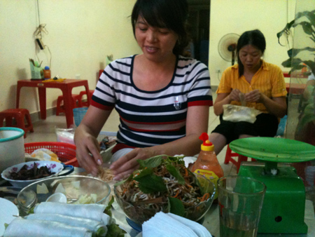Dùng tay trần cuốn nem, phở cho khách, chốc chốc chị lại nhận tiền, trả tiền thừa cho khách rồi lại tiếp tục cuốn nem |