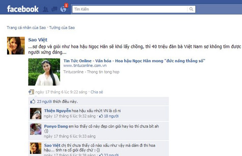 Từ bài báo này, trên trang facebook mang tên Sao Việt (của Hoàng Anh, vợ cũ diễn viên Huy Khánh) xuất hiện lời bình luận: "Sợ đẹp và giỏi như hoa hậu Ngọc Hân sẽ khó lấy chồng, thì 40 triệu đàn bà Việt Nam sợ không tìm được người xứng đáng". Thế rồi, câu chuyện bất ngờ chuyển sang hướng khác khi các friend của Sao Việt chê bai nhan sắc đương kim Hoa hậu Việt Nam. Và những lời bàn tán rôm rả được bắt đầu...