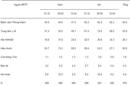 Nơi được thanh thiếu niên nhắc đến như một địa điểm cung cấp các BPTT nhiều nhất là Trung tâm y tế (63,9%); Hiệu thuốc (62,9%) và Bệnh viện/Phòng khám (56,5%). Tỷ lệ thanh thiếu niên biết Hội KHHGĐ là nơi cung cấp các BPTT tương đối thấp (29,1%). (xem bảng 1 dưới đây).