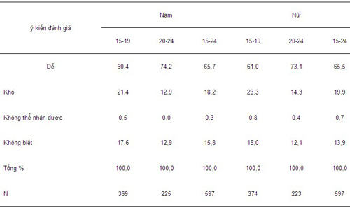 Có tới 65,5% số đối tượng điều tra cho rằng việc nhận và sử dụng một BPTT nào đó nếu họ muốn là dễ dàng và độ tuổi càng cao thì việc tiếp nhận và sử dụng càng dễ dàng hơn. Không có sự khác biệt giữa các em trai và các em gái trong đánh giá về mức độ dễ dàng của việc tiếp cận dịch vụ tránh thai. Tỷ lệ thanh thiếu niên cho là việc tiếp cận dịch vụ tránh thai khó khăn chỉ chiếm khoảng 20% và tỷ lệ thanh thiếu niên không biết việc nhận và sử dụng tránh thai là dễ hay khó chiếm khoảng 14%. Trong đó, tỷ lệ các em trai cho rằng việc nhận và sử dụng BPTT là khó khăn cao hơn tỷ lệ này ở các em gái. Tỷ lệ trả lời không biết ở các em trai cũng lớn hơn các em gái. Tỷ lệ thanh thiếu niên cho việc nhận và sử dụng một BPTT nào đó là dễ dàng tăng lên khi trình độ học vấn được nâng cao (43,8% thanh niên chưa tốt nghiệp tiểu học, 60,4% thanh niên tốt nhiệp trung học cơ sở và 75% thanh niên tốt nghiệp phổ thông trung học)