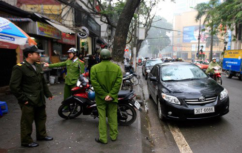 ![]() Nhưng trên phố Bà Triệu đoàn qua Viện Mắt trung ương lại được công an phường Nguyễn Du tổ chức vận đông, nhắc nhở người dân không để xe trên vỉa hè. |