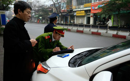 ![]() Công an phường Ngô Thì Nhậm xử lý chiếc xe ô tô đỗ trên vỉa hè phố Huế |