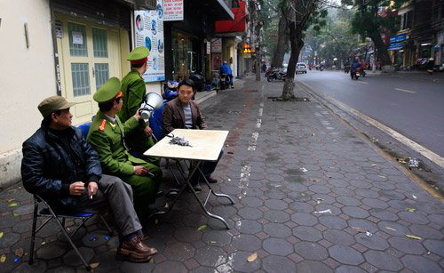 ![]() Công an phường Lê Đại Hành nhắc nhở người dân không để xe trên vỉa hè, căng ô, căng bạt bán hàng |
