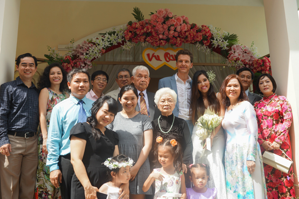 Cô dâu, chú rể chụp ảnh cùng người thân bên nhà gái. Sau lễ vu quy, ngày 14/11 tới, Hồ Bích Ngọc còn tổ chức tiệc cưới tại TP HCM, mời bạn bè đến chung vui. Sau đó, cặp đôi sẽ qua Thụy Sỹ hưởng tuần trăng mật và thăm hỏi gia đình chồng Bích Ngọc.