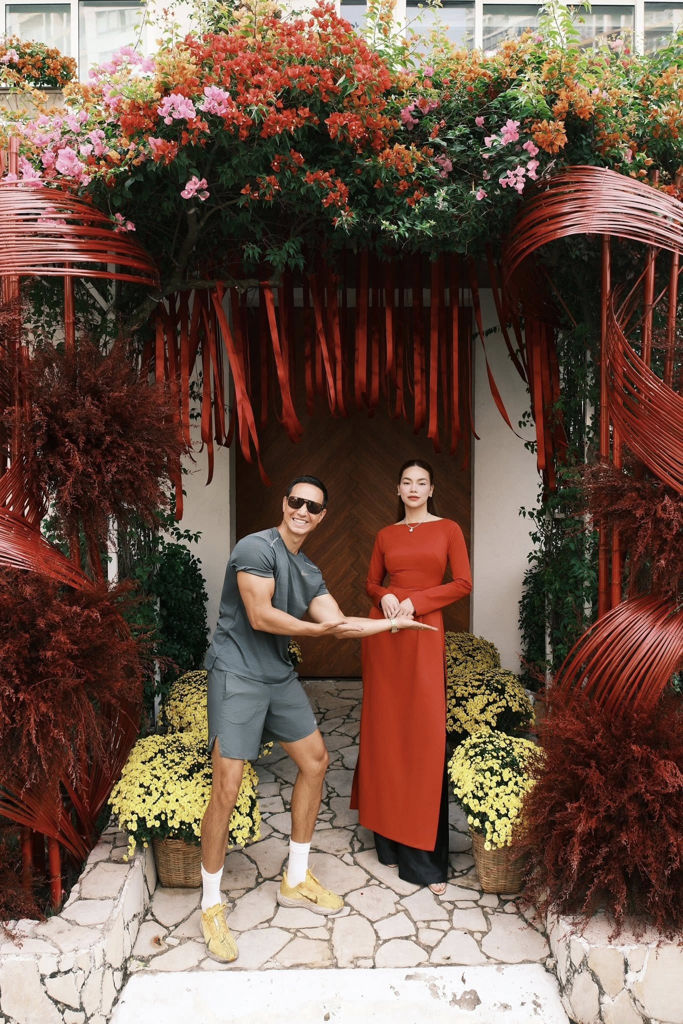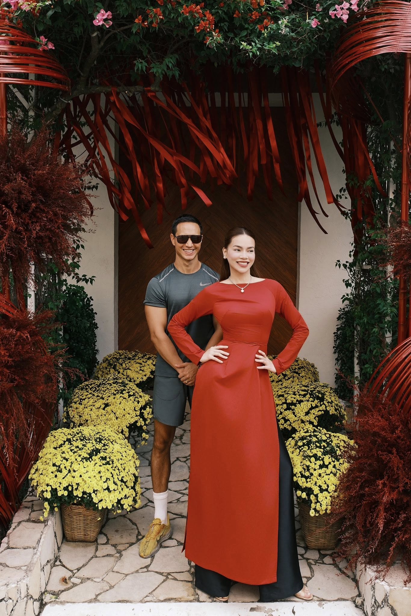 Nữ ca sĩ quê Quảng Trị khoe ảnh diện áo dài màu đỏ bên những chậu cúc vàng tươi tắn. Và điều đặc biệt, không thể thiếu hình bóng chồng cô là diễn viên Kim Lý. Họ khoe khoảnh khắc bên nhau trong ngày đón xuân ấm áp.