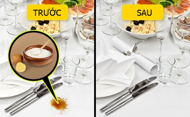 Để loại bỏ vết bẩn do dầu mỡ, rắc lên trên đó một chút tinh bột. Sau đó, chỉ cần giặt lại bình thường.
