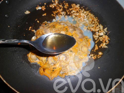 Bước 3: Phi thơm tỏi, cho ruột sò vào xào cùng một chút nước mắm. |