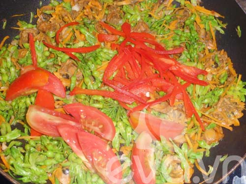 Bước 4: Xào sò trong vòng 30 giây, cho cà rốt vào xào cùng trong 30 giấy tiếp theo. Tiếp tục cho hoa thiên lý, cà chua vào xào cùng. |
